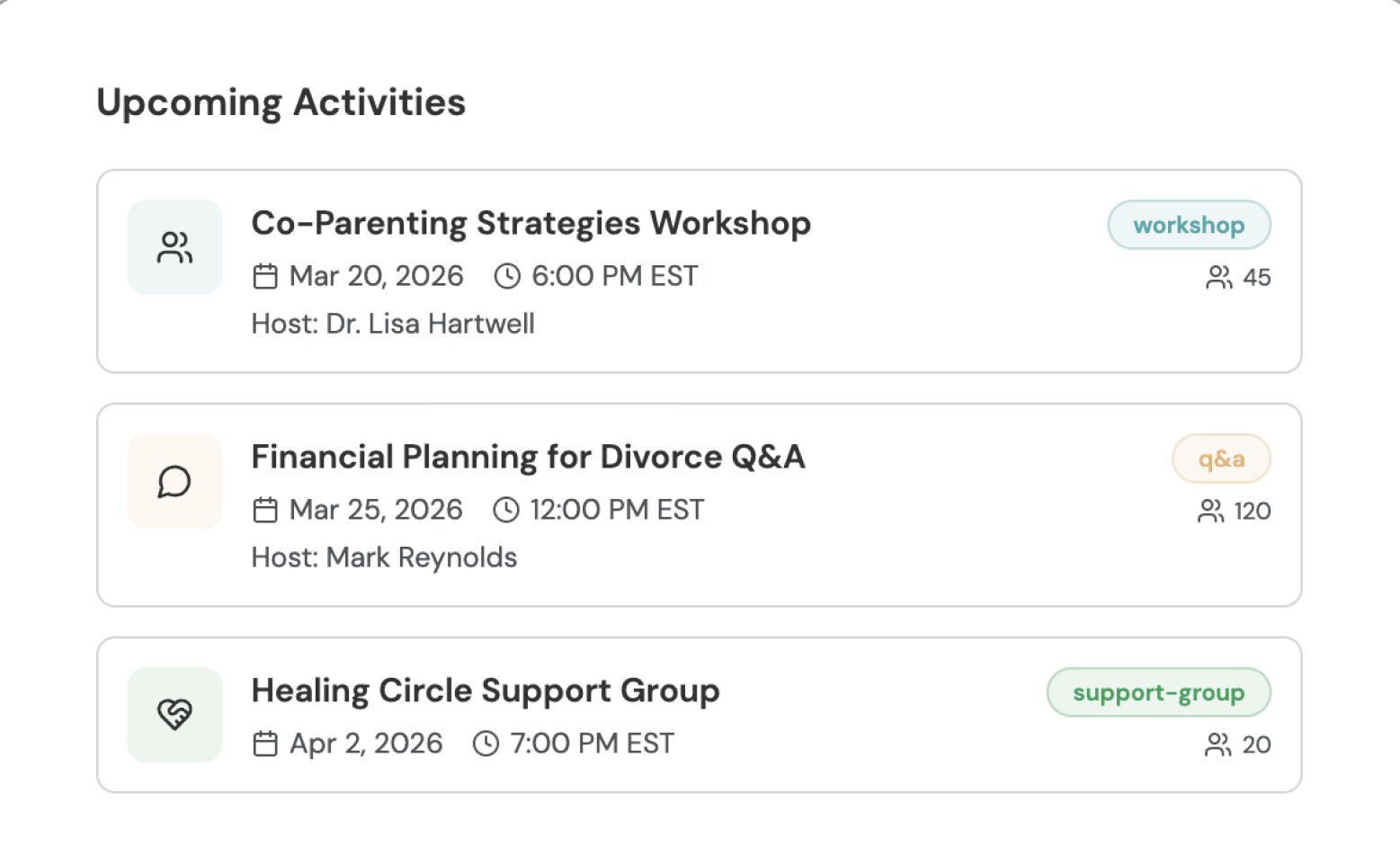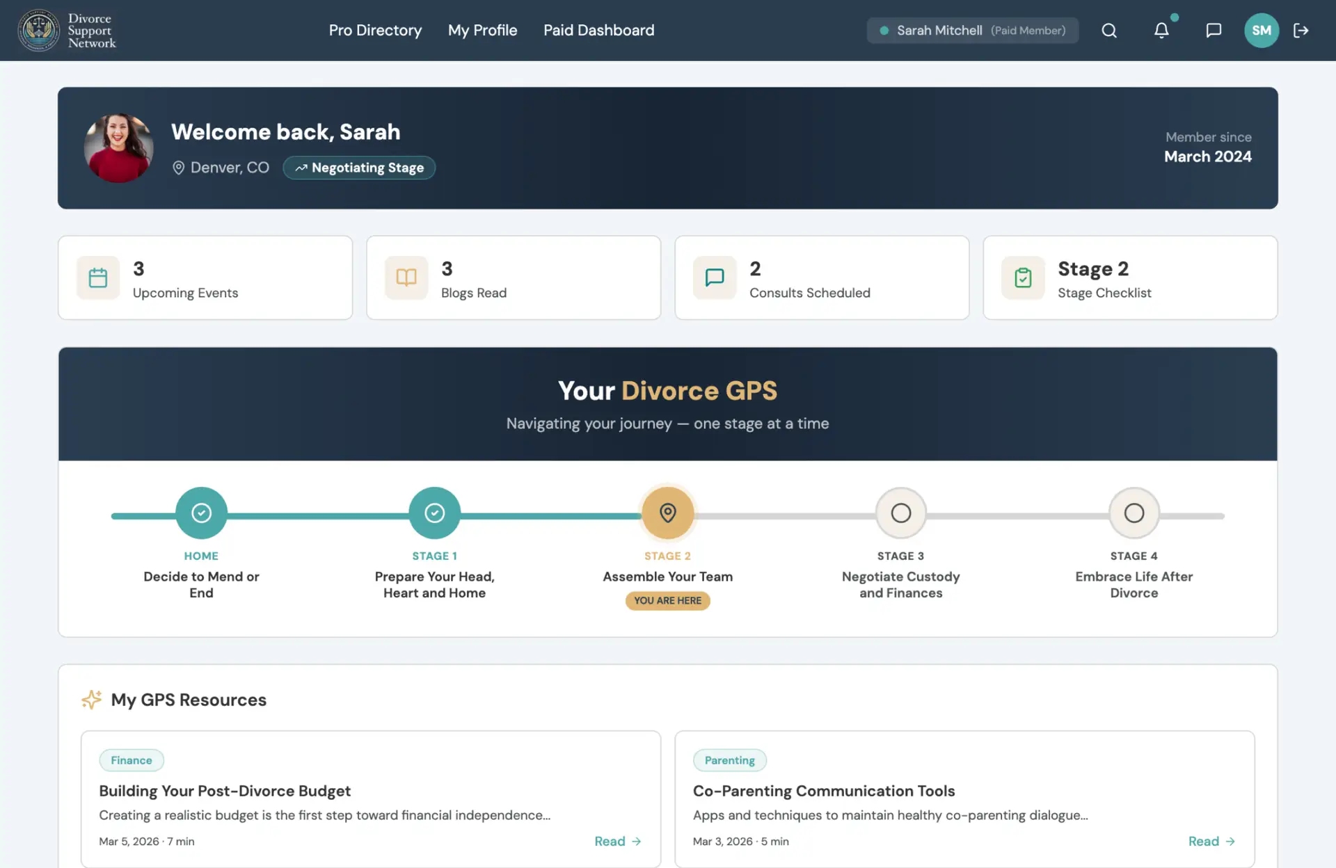 Learn, connect, and grow as your needs evolve through each stage of divorce.